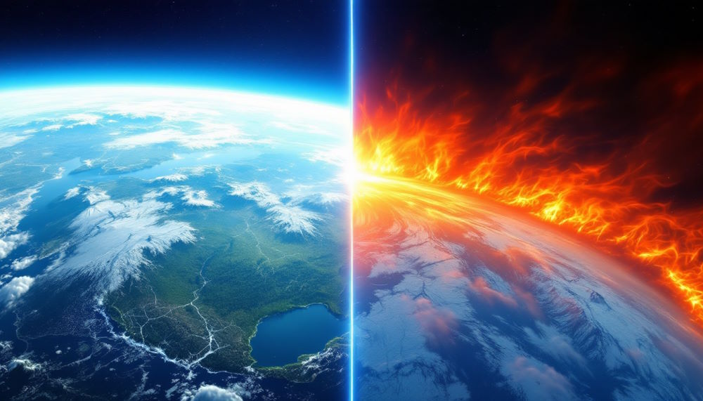 Uma ilustração realista mostrando a Terra vista do espaço, com suas camadas atmosféricas destacadas. A imagem compara o efeito estufa natural e o aquecimento global. À esquerda, cores verdes e azuis representam o efeito estufa natural, onde gases como vapor d'água retêm radiação infravermelha. À direita, tons de vermelho e laranja ilustram o aquecimento global, destacando o aumento de CO2 e outros gases de efeito estufa devido a atividades humanas. A cena captura a diferença entre os processos, com uma representação clara e realista de seus impactos no clima global.